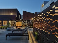 The pool deck and fireplace at Brick Avenue Lofts, with custom steel fabrication by modus shop, are elements of a carefully constructed sequence of layers that dissolve barriers between public, semipublic, and private spaces.